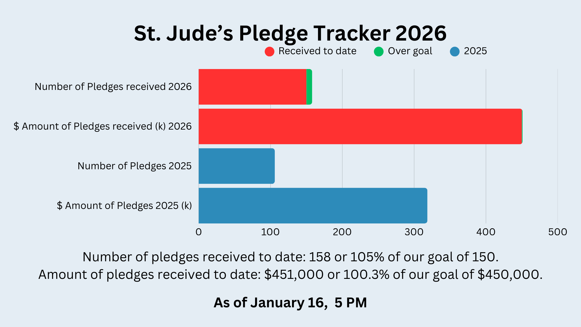 We are thrilled to inform you that our annual pldge campaign for support of St. Jude's mission and ministries has acheived its goals, having received 158 pledges (150 goal) for $451,000 (450k goal).